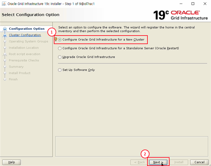 - Configure Oracle Grid Infrastructure for a New Cluster 선택