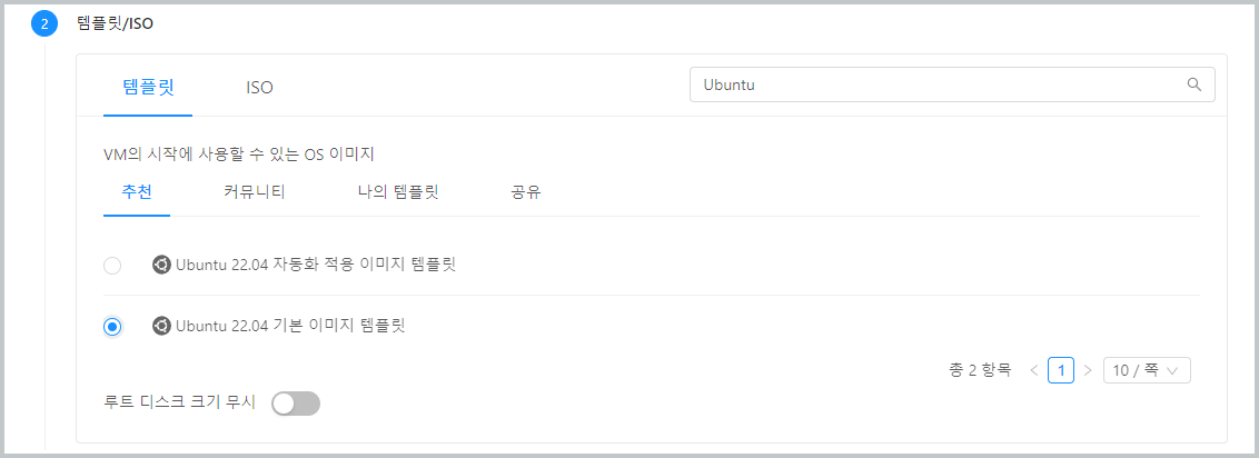 템플릿/ISO : Ubuntu 기본 가상머신 템플릿 이미지를 다음의 그림과 같이 선택합니다.