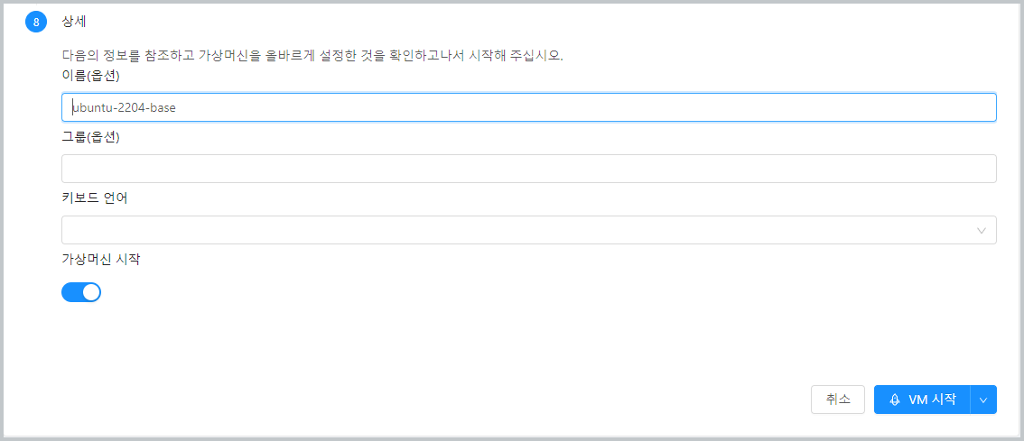 상세 : 가상머신 이름 (예를 들어 ubuntu-2204-base)을 다음과 같이 입력합니다.