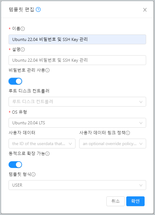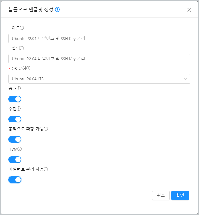 템플릿/ISO에서 비밀번호 관리/SSH Key 쌍 관리 기능이 포함된 템플릿 이미지를 선택합니다.