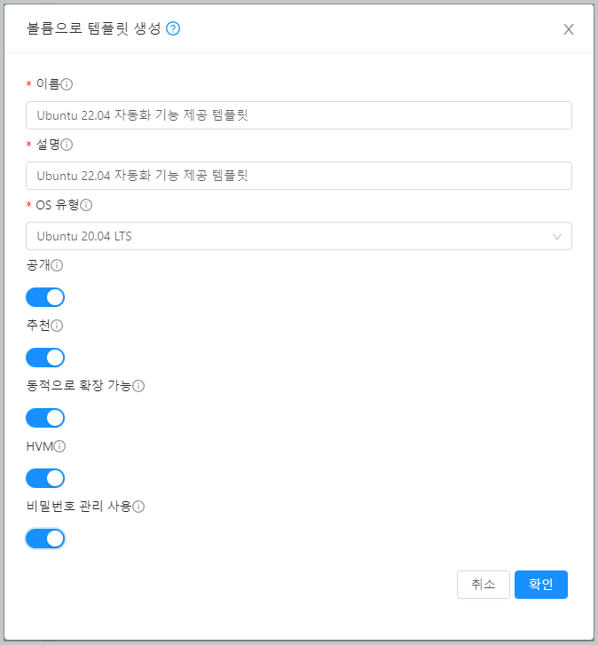 본 문서의 예제에서 사용되는 가상머신 이미지는 Ubuntu 가상머신 가이드의 비밀번호 및 SSH Key 관리 가이드에서 생성한 비밀번호 및 SSH Key 관리가 가능한 가상머신 템플릿 이미지를 사용합니다.