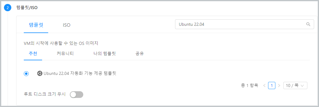 먼저, 템플릿 이미지를 이용해 가상머신을 생성하여 실행합니다. 앞서 생성한 가상머신 템플릿 이미지를 선택하고, 적합한 네트워크 및 컴퓨트 오퍼링 등을 선택한 후 가상머신을 생성합니다.